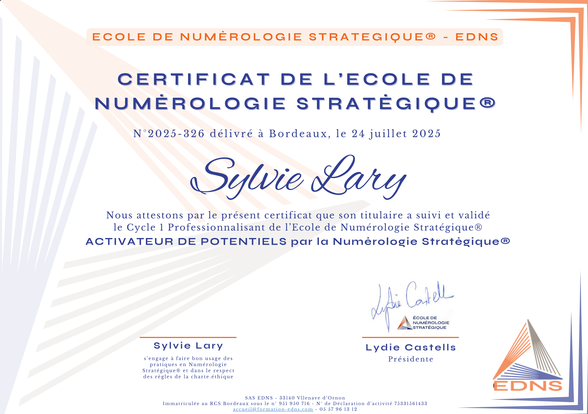 Je me suis formée à la numérologie stratégique auprès de l’EDNS, sous la supervision de Lydie Castells.